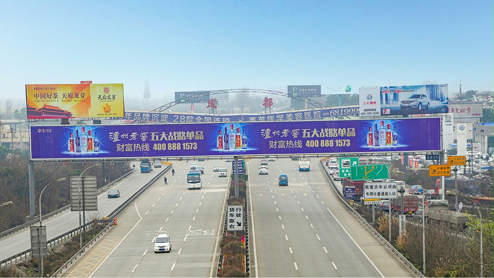 成雅龍門(mén)架廣告(收費(fèi)站旁):該戶外廣告位于成雅高速收費(fèi)站前200米,300平米的超大媒體。氣勢(shì)雄偉,關(guān)注度高。強(qiáng)制性宣傳效果好。