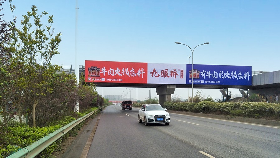 成自瀘天橋廣告位于收費站旁,是通往萬安,麓山大道,三岔湖等地的快速通道。雙面天橋媒體,可覆蓋往來行人、車輛,受眾面廣推廣效果好。