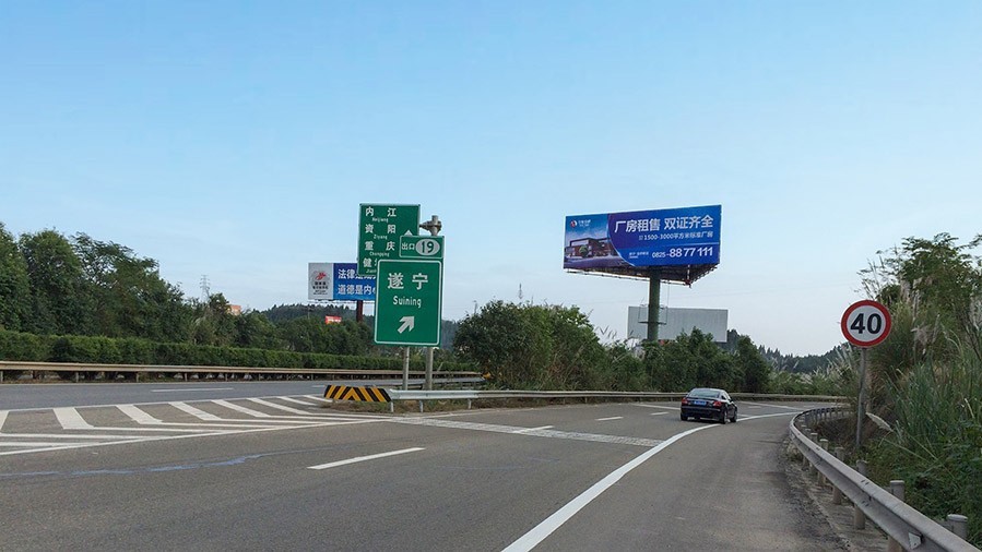 渝遂高速?gòu)V告(遂寧出入口):該戶外大牌所處地段 位于收費(fèi)站口,車流量大、車速緩慢,周邊無(wú)遮擋,可視距離遠(yuǎn),廣告推廣效果好。