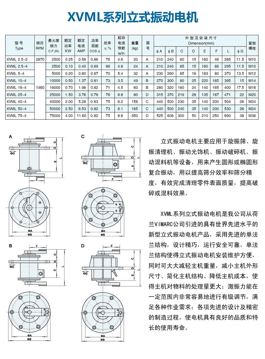 、旋振清理機、振動光飾機、振動破碎機、振動混料機等設(shè)備,用來產(chǎn)生圓形或橢圓形復(fù)合振動,用以提高篩分效率和篩分精度,有效完成清理零件表面質(zhì)量,提高破碎或混料效果。XVML系列立式振動電機是我公司從荷蘭VIMARC公司引進(jìn)的具有世界先進(jìn)水平的新型立式振動電機產(chǎn)品,采用先進(jìn)的單法蘭結(jié)構(gòu)